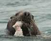 Captain Leif Skog, an excellent observer, first noticed an ivory gull. These birds are often associated with polar bears that have made a seal kill on the ice. On cue, Eric our polar bear finder, searched and located a male laying on a large piece of ice. As the ship approached slowly the bridge and bow once again filled with eager guests. The bear appeared to be laying on something covered with snow, and as we approached more and more glaucous and ivory gulls landed around the resting bear in search of a meal. With the ship stopped we all watched the bear as it rested then decided to unbury the ringed seal it was laying on.