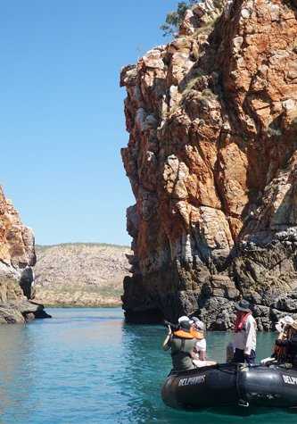 The day’s first Zodiac excursion sees us heading up the narrow confines of the bay and into Cyclone Creek, not only to explore what biota is on offer, but also to investigate how the geological processes specific to this location have shaped the sandstone plateau. We have now departed from the central section of the Kimberley craton’s plateau where the sandstone laid flat and begin to approach the seaward margin of the King Leopold erogenous zone where two land masses collided. Evident buckling and bending is a testament to the incredible forces that thrust previously horizontal layers of sandstone into vertical and obtuse planes.