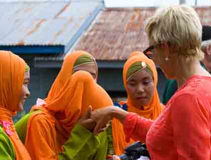 Many friendly faces greeted us as we set foot onto the boardwalk of the tiny fishing village, Tanjung Kumbik, in the Natuna Archipelago. We had some time to stroll around and everyone marveled at the beautiful wooden houses built on stilts along the coastline of this small, remote island in the South China Sea. Purple, orange, blue, green, yellow—simply every color imaginable as far as the eye could see! But not just the houses were colorful—the dancers, treating us to a wonderful performance, shone even brighter.