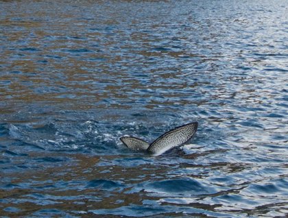 On our approach we could tell that it was something unusual that we had before us. Gradually and after guessing out loud a couple times, we realized that the carcass of a medium-sized sperm whale drifted slowly with the current. We could see some motion, which was quite confusing, since the leviathan was evidently not alive. Suddenly, a fin broke the surface of the water and the tail of the deceased cetacean shook violently. By now we knew that we were witnessing something that none of us had ever seen before. A great white shark feasted on the sperm whale, and as the ship approached, we could get better and better looks. The shark, which was about four meters long, slowly cruised under the ship several times. How mesmerizing it is to see such a mythical creature, surrounded by legends and feared by most!