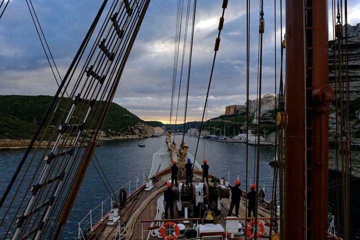 Historian Tom Heffernan gave an informative talk, “From Mecca to Al An-Andulus,” a history of Islam and its presence in Spain as a preparation for our visit tomorrow to the Alhambra. After lunch, the Sea Cloud’s boutique shop opened selling items featuring the Sea Cloud logo. At 3 PM we were surprised with a special opportunity, as the seas have to be just right: a Zodiac cruise around the Sea Cloud while she was under sail. This was a fabulous opportunity, particularly for those of who take pictures. How often does on get a chance to photograph a square masted sailing ship at sea – a ship designed after those vessels of the last quarter of the 19th century when sail was still king.
