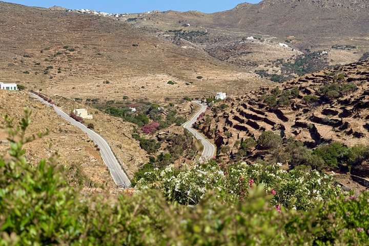 Along the way, we stopped to admire and photograph a cluster of the distinctive dovecotes of Tinos. Introduced by the Venetians, doves provided both food and fertilizer to the Greeks of Tinos. Over the generations, the islanders build and refined the two-story, square structures to house the doves and to collect their guano. Built of stone and decorated with a lacey façade of slate, these structures are a distinctive cultural expression of Tinos.
