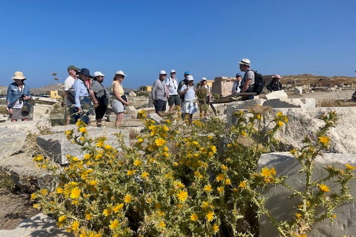 Crossing the ridge of the island in the north, we descended to the charming town of Pyrgos. We made a short visit to the town’s excellent Marble Museum, showcasing the mining and working of the fine marble for which Pyrgos and the island are famous. We then descended by foot into the village, passing among the whitewashed Cycladic houses with carved marble lintels or plaques above colorfully painted doors and windows. We arrived to the memorable central “square” with an enormous and gnarled European plane tree at its center. The square is surrounded by cafes, and our guests took a drink and tried the local galaktobureko sweet.