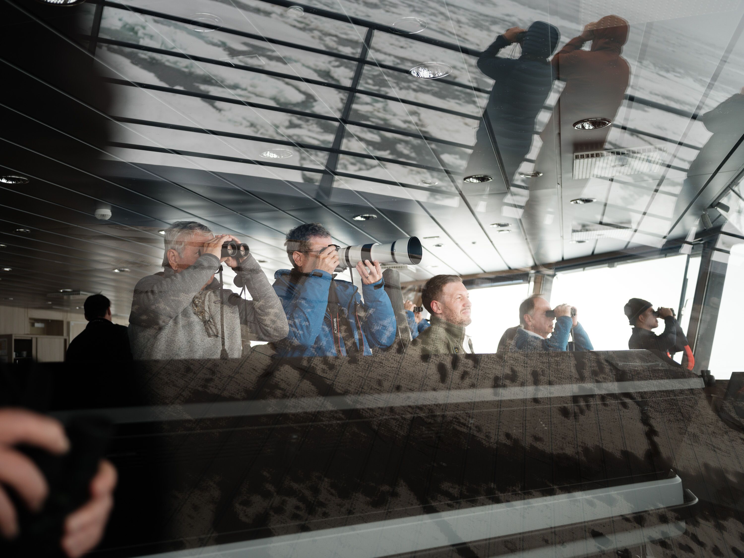 National Geographic Resolution awakened in the calm embrace of Liefdefjorden, the fjord's surface as still and soft as a cottony mirror. Guests had the choice of exploring the serene waters by kayak or enjoying the breathtaking sight of tidewater glaciers during a Zodiac cruise. The reflections on the water were truly stunning, offering yet another rich and unique perspective on the magic of Svalbard. The air was alive with birdlife such as king eiders, long-tailed ducks, great skuas, and arctic terns circled above and settled on ancient moraines, adding life and sound to the Arctic stillness. For the adventurous, the legendary polar plunge was on offer, an exhilarating dive into the icy waters. Seven-year-old Tulia, full of spirit, even jumped several times alongside her father, Kimmo! After another epic lunch onboard, guests gathered for a disembarkation briefing followed by an inspiring lecture from National Geographic photographer Sergio Pitamitz, who shared stories from his ongoing work in visual storytelling. Later, once the relaxing wine and cheese teatime came to its end, a pod of white-beaked dolphins unexpectedly appeared, breaching near the ship and playfully, inviting the guests to the bridge, once again. Once the marine mammals left, delaying the start of the captain’s farewell cocktail, all guests and staff members enjoyed the emotional slideshow put together by Giulia Ciampini with all the pictures collected from our 14-day adventure.