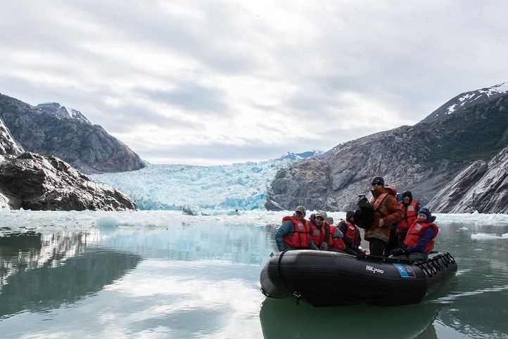 Sailing through Holkham Bay into Tracy Arm-Fords Terror Wilderness, we find ourselves once again in the presence of ice. The misty morning creates beautiful reflections on the water of the rich blue icebergs and seals make take watchful glances at us as we pass. The actively calving South Sawyer Glacier is an amazing place to spend the morning exploring by Zodiac. Our final day wouldn’t be complete without the chance to swim in Alaska’s chilly waters during the afternoon’s polar plunge.