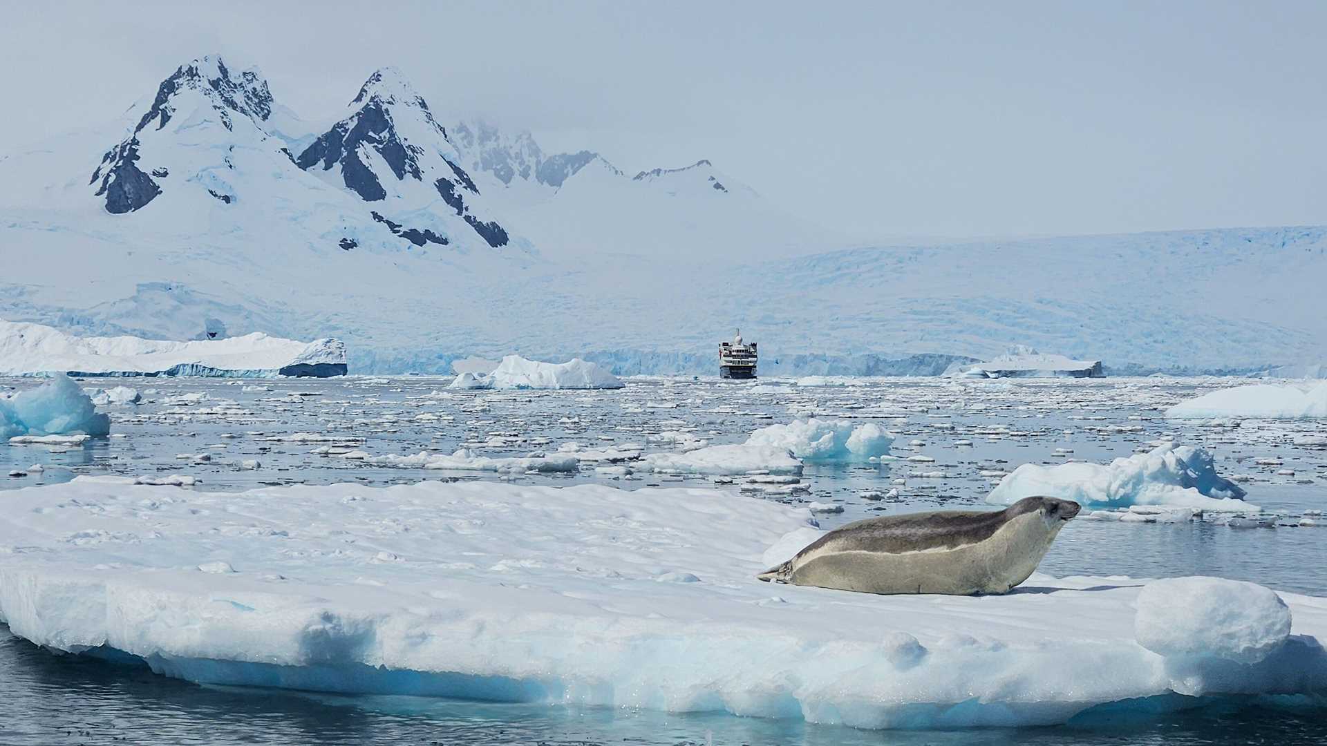 We spent our morning traversing Orleans Strait along the Trinity Peninsula. We looked for wildlife and appreciated stunning views of icebergs and glacier-capped mountains. We sailed south until we arrived at Cierva Cove, a beautiful bay full of ice and wildlife. The clouds broke around lunch, revealing a brilliantly sunny afternoon. We explored the outer reaches of Cierva Cove by Zodiac, where we encountered minke and humpback whales, leopard and crabeater seals, and chinstrap and gentoo penguins. Once back aboard National Geographic Explorer, we pushed farther up into the thick ice near the face of the glacier and took in the stunning views of the surrounding peaks. After a few drinks and dinner, we headed farther south through Gerlache Strait, watching distant humpback whales spouting under the sunset.