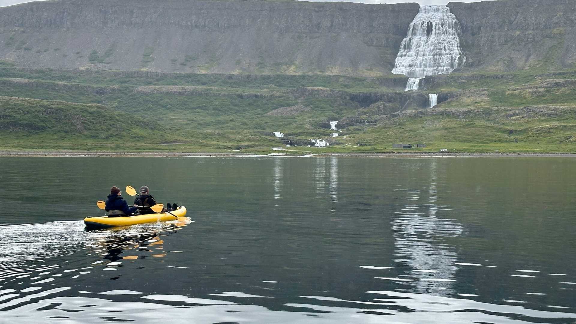 Calm and soft would be the best description of the conditions for our early wakeup, deep in Arnarfjörður, named after the first Norse settler of the region. At the head of the fjord is Dynjandisvogur, the “thundering waterfall,” one of the most spectacular of the many famous waterfalls in Iceland. The lower half is a series of cascades and drops through narrow gorges, with a well-developed trail leading to the base of the upper falls. A diaphanous veil of water seems to pour out of the sky over the many layers of basalt, which form sharp cliffs lining the fjord. With slowly clearing skies, we had opportunities to both hike the trails and kayak in the still waters below.