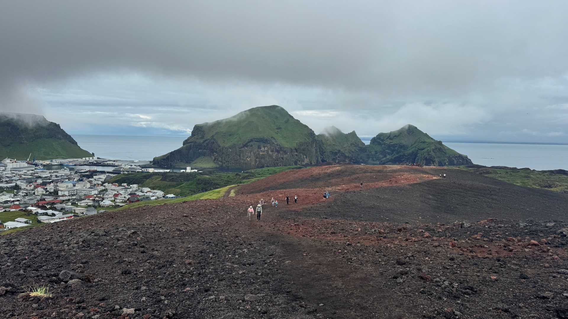 Our afternoon was spent touring the tiny island of Heimaey (Home Island). Some chose the scenic panoramic tour which stopped at amazing vistas and lookout points, including one of the windiest points in the northern hemisphere, Stórhöfði, a bird blind on the southernmost point and a visit to the Eldheimar Volcano Museum which artfully portrays the history of the 1973 Eldfell eruption. Some of us chose to climb up the Eldfell Volcano through a layer of dense fog towards the top. We enjoyed views of the new lava that nearly shut down the harbor, which would have meant an end to the town of Heimaey.