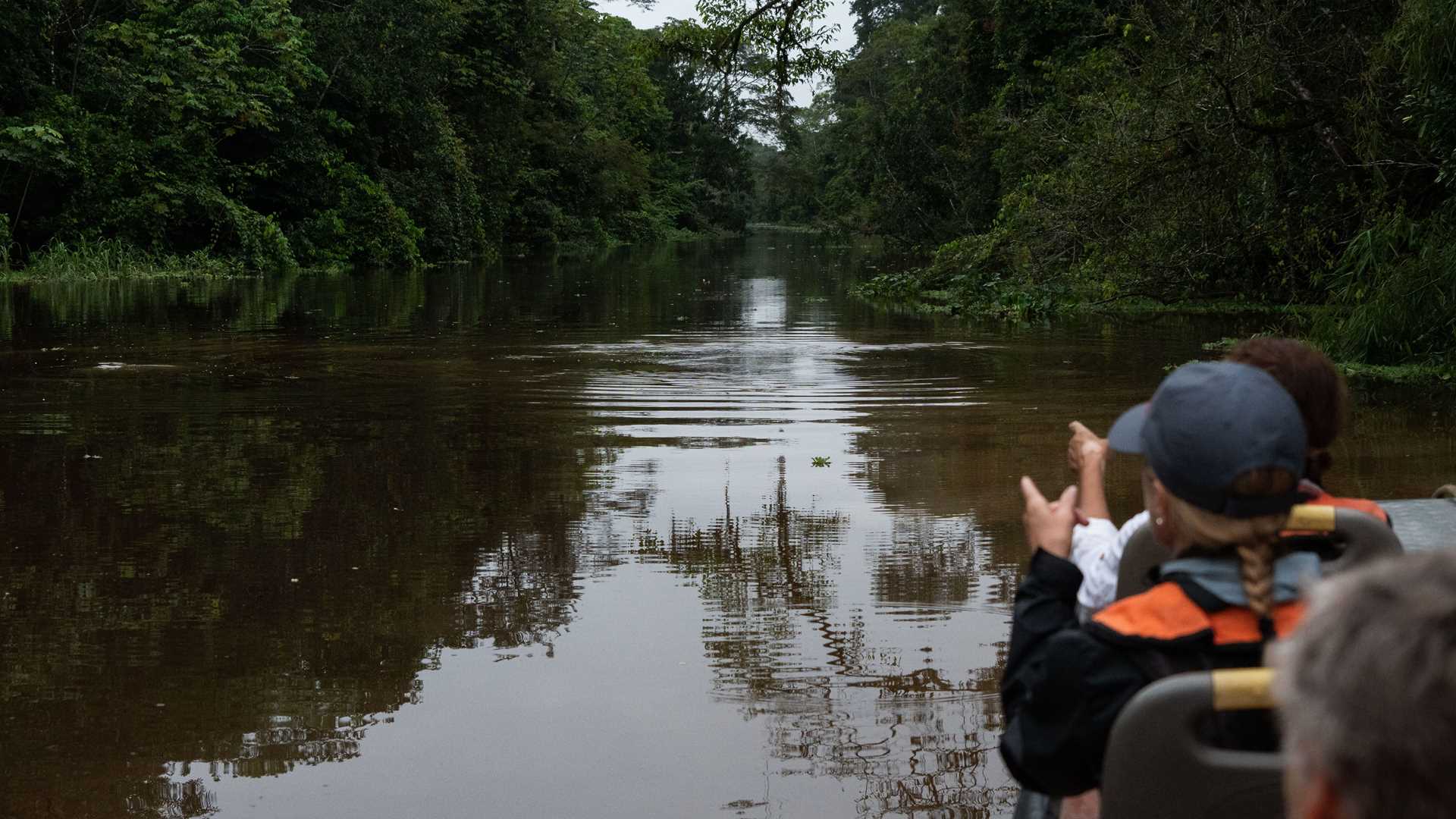 This was the first full day of our expedition in the Upper Amazon, and it was nothing short of extraordinary. Our morning began with a pre-breakfast skiff outing at Yanayaquillo Creek where we navigated the black waters, spotting pink river dolphins while the sounds of the forest enveloped us. The calls of tree frogs and cicadas formed a natural symphony, and we remained silent to take in the vibrant colors and sounds of our surroundings.