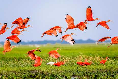 Each day, as dusk nears at Caroni Swamp on Trinidad’s west coast, hundreds of scarlet ibises—which get their brilliant color from a diet of crabs—return to the mangrove trees to roost. “You’re looking at this deep green wall of trees as the sun is setting, and in start flying the most spectacularly vibrant, scarlet-red flocks of birds,” Greenfelder explained. They fill the mangroves so densely that, from a distance, the trees appear to be in full bloom with flowers. It’s a one-of-a-kind wildlife spectacle even non-birders will get a thrill from.