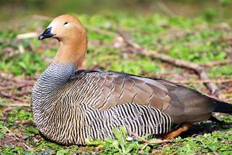 Small and plump, with a barred pattern of feathers, solid russet head, and crayon-orange legs, this South American goose is quite stunning. They’ve historically nested by the thousands in Tierra del Fuego and southern Patagonia, but their numbers have decreased dramatically. Only about 1,000 remain in all of Argentina and Chile. These days, they’re more common to encounter in the Falklands, wandering in meadows with very little fear of onlookers.